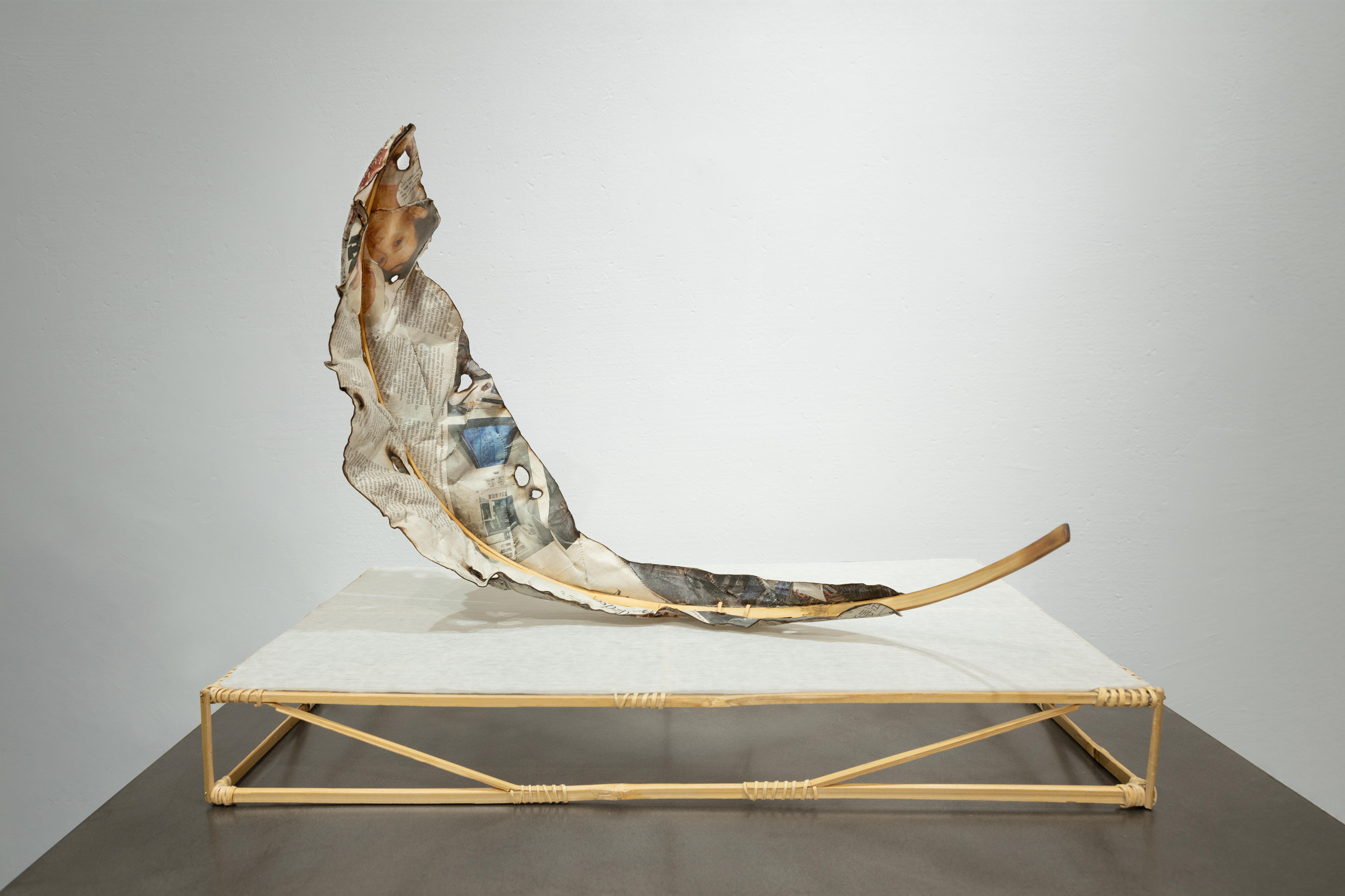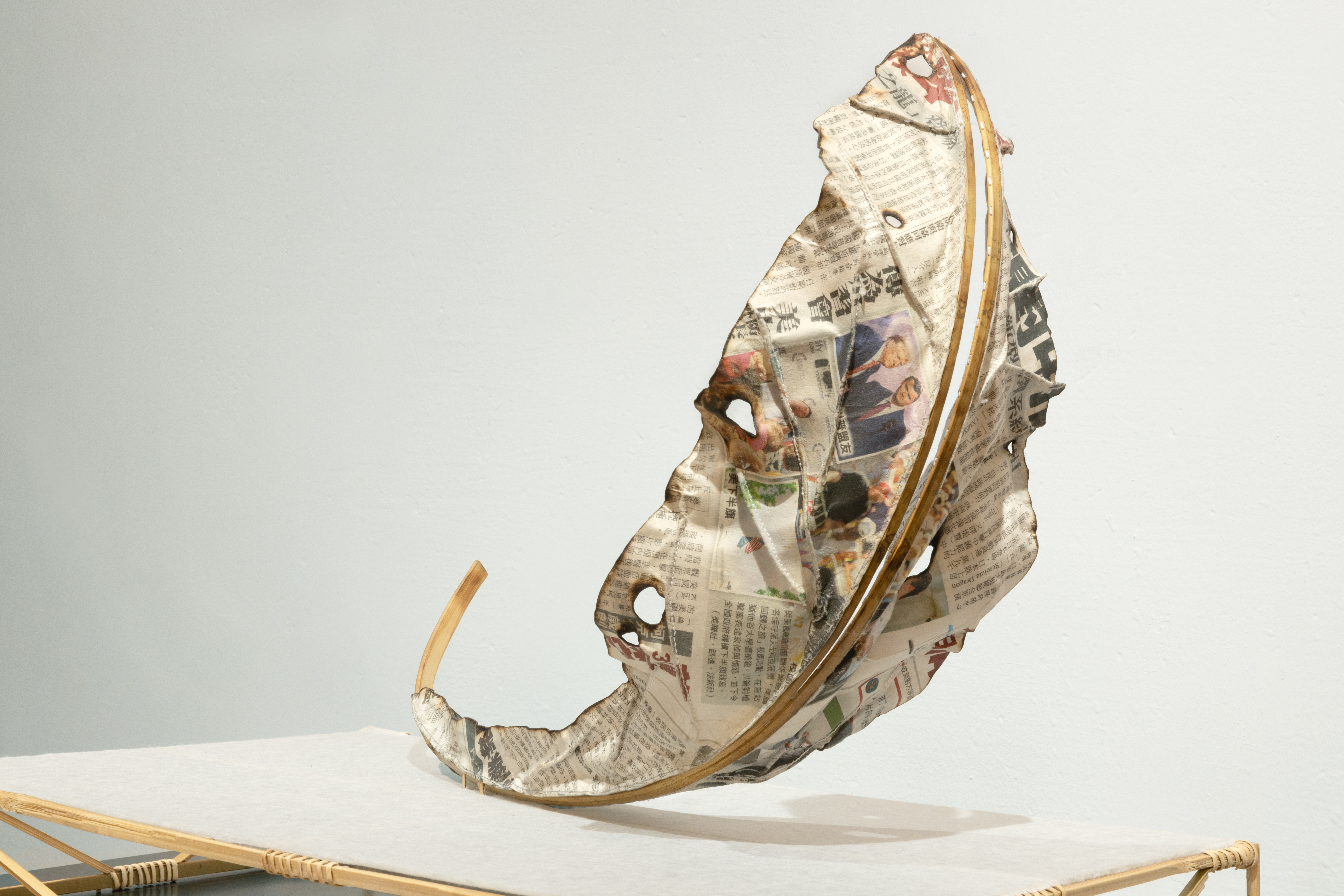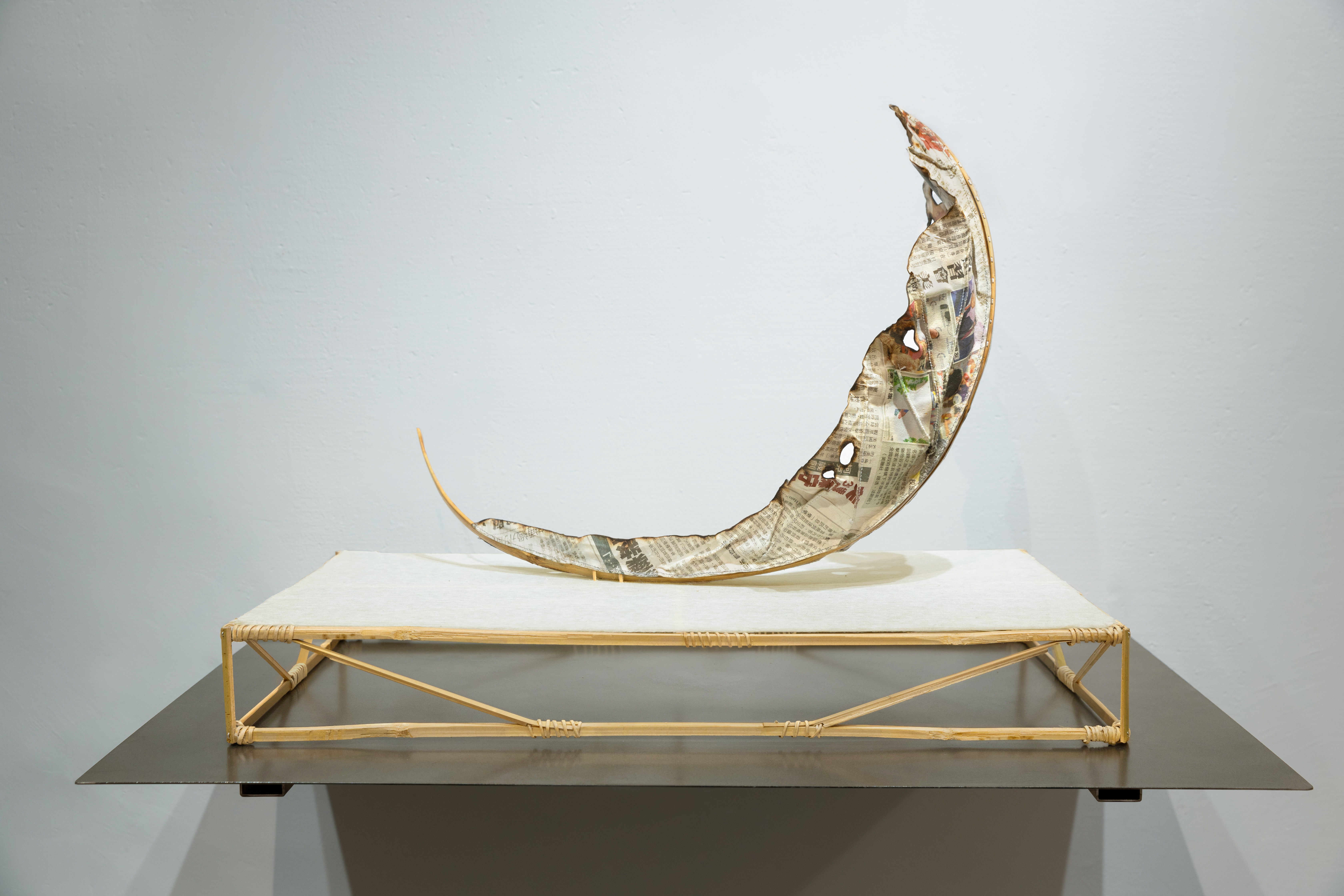 De-acidified and UV-sealed newsprint, bamboo, linen, archival PVC adhesive, cotton, polyester batting, rattan, cloth, acrylic sheet, steel wire