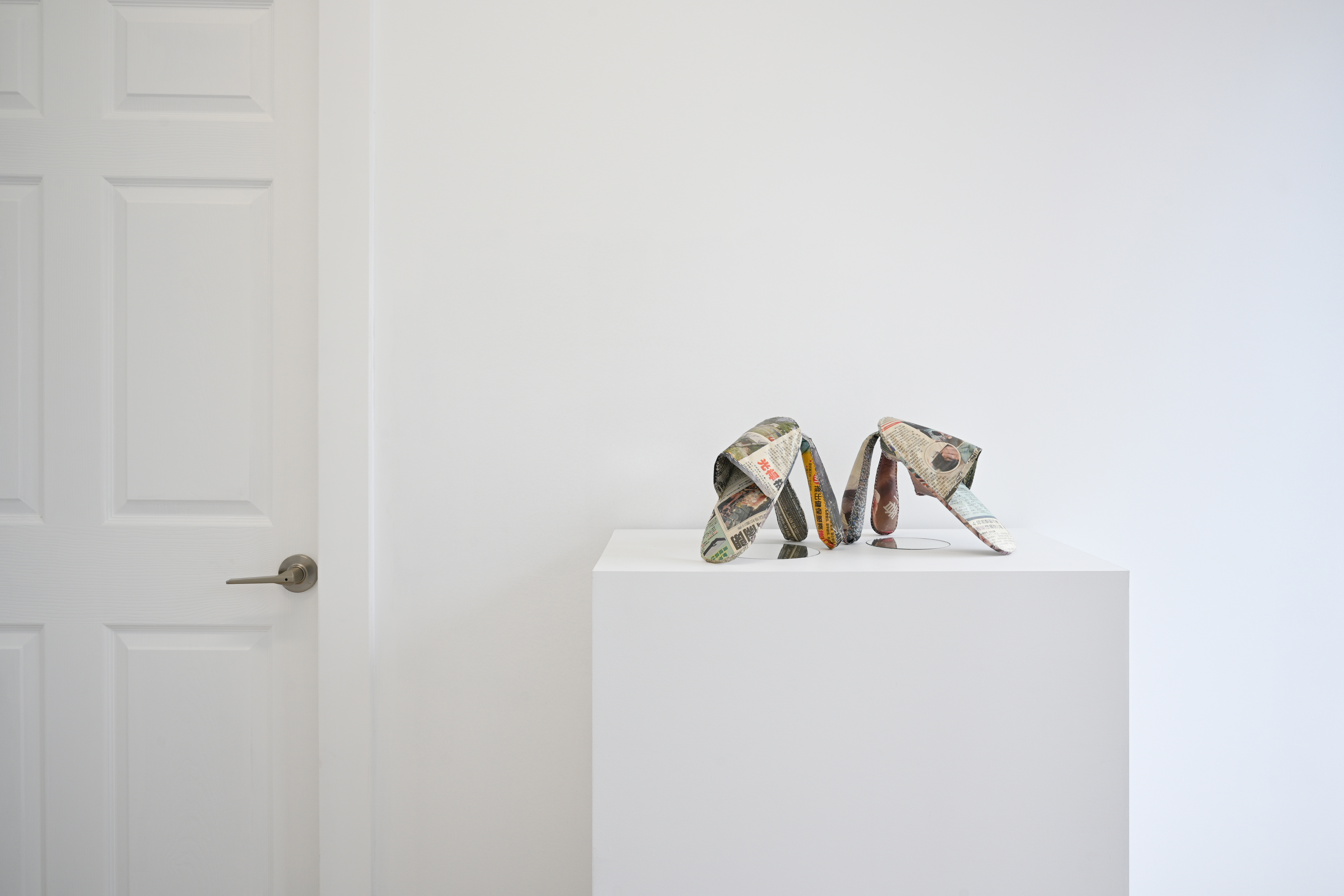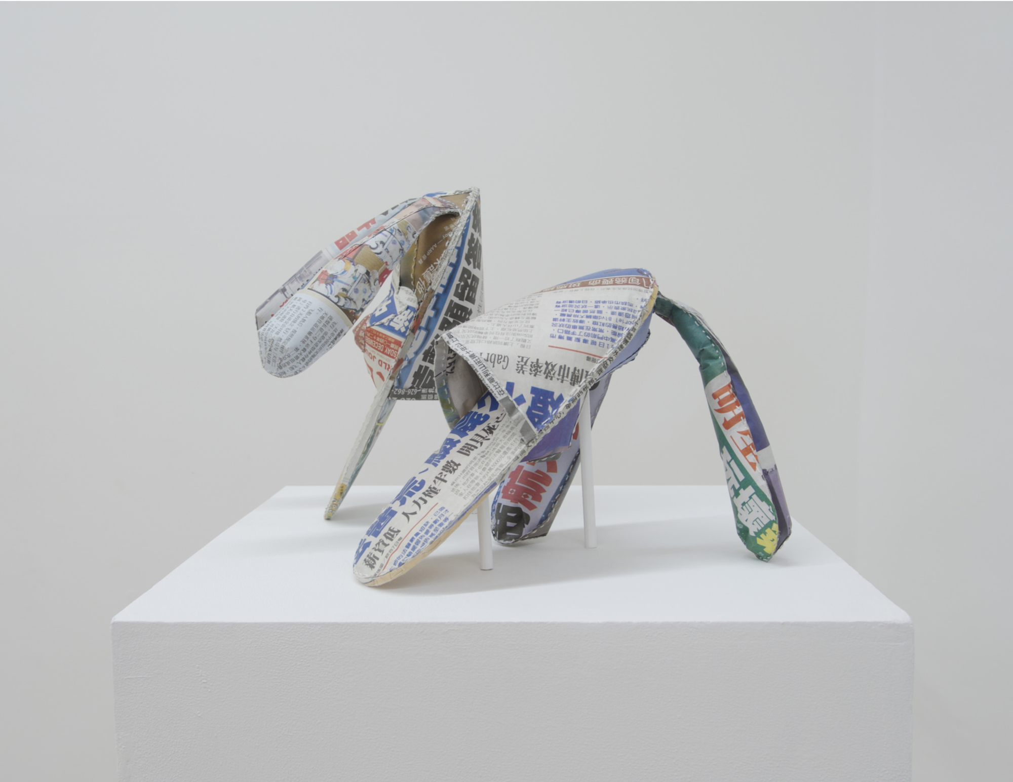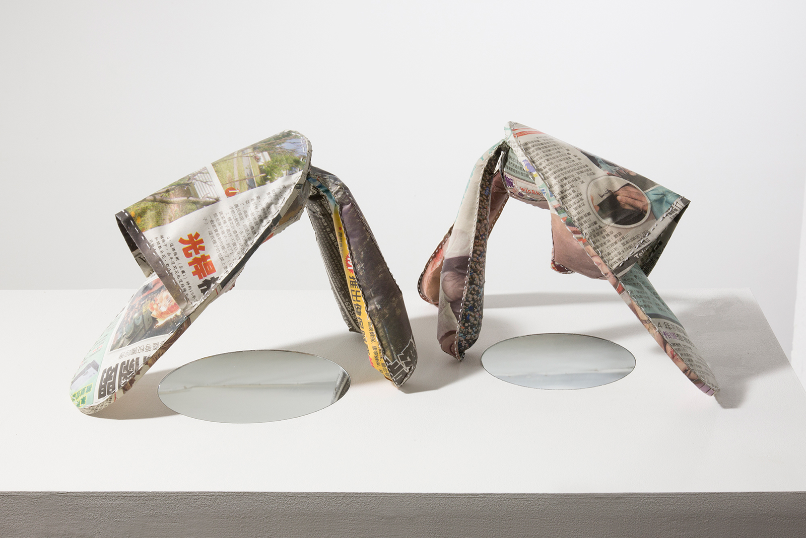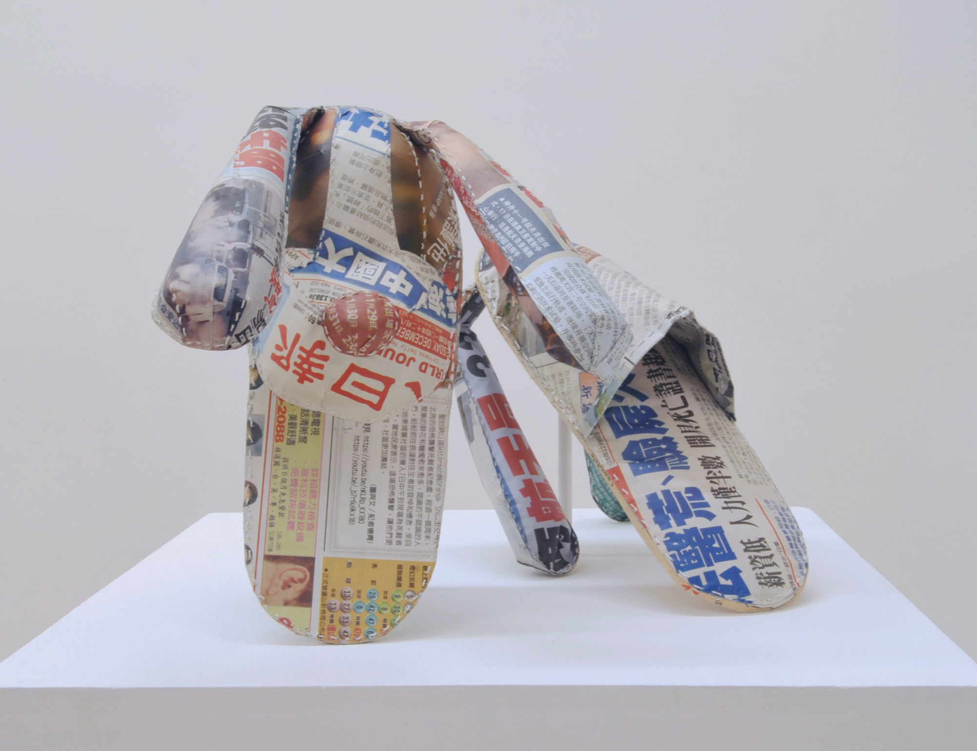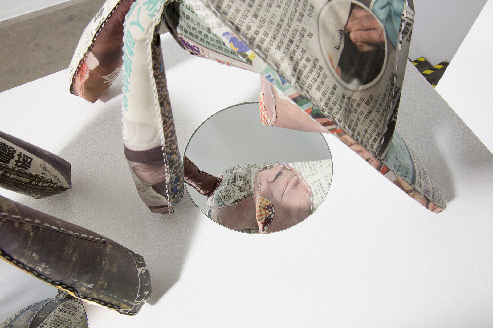De-acidifi ed and UV-sealed newsprint, polyester fi berfi ll, vinyl, aluminum, Gatorfoam (rigid foam board), sewing thread