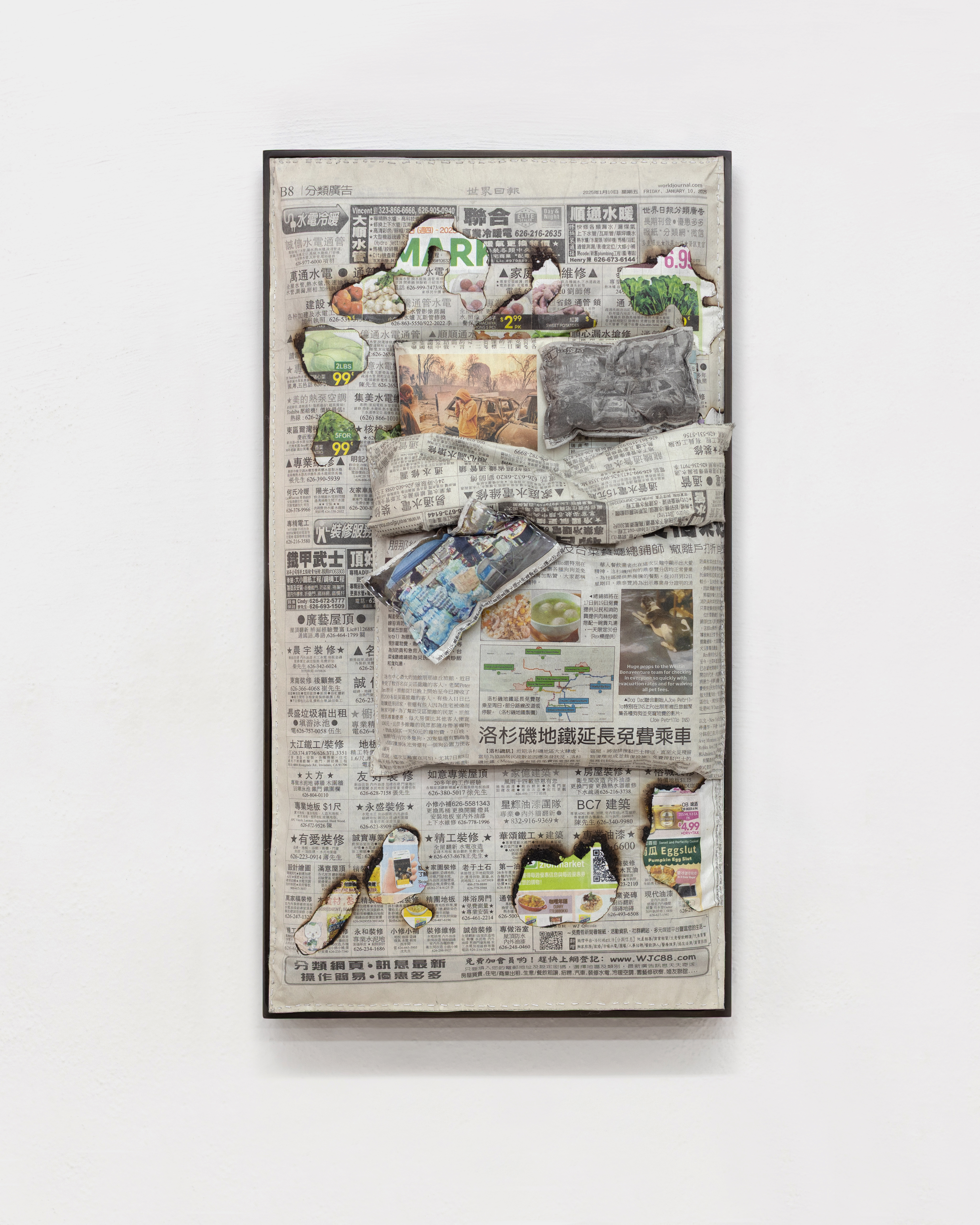 De-acidified and UV-sealed newsprint, polyester fiberfill, vinyl, Coroplast (archival corrugated plastic), steel frame